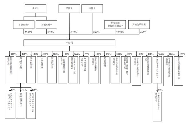 在云知声的股权架构中,梁家恩、黄伟、康恒为一致行动人,合计持股33.93%。梁家恩直接持股3.78%,黄伟通过云思尚义、云创互动间接持股24.08%、3.8%,康恒直接持股2.27%