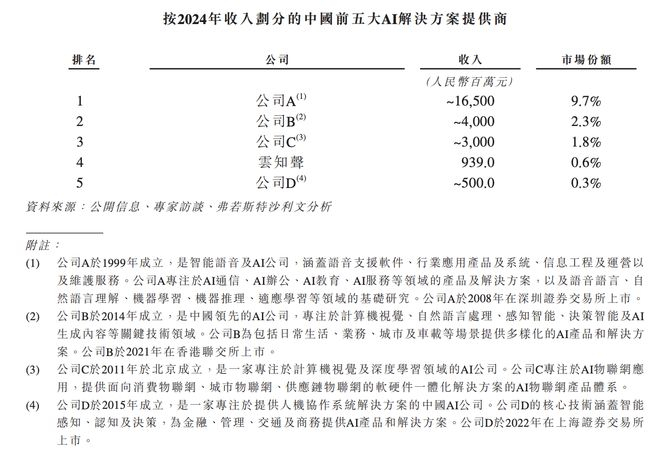 全球知名企业咨询公司沙利文的数据显示,按收入计,2024年,云知声是国内第四大AI解决方案提供商,市场份额为0.6%。在其布局的日常生活、医疗赛道中,云知声在国内日常生活AI解决方案中排第三,医疗排第四。可以推测得出,公司A为科大讯飞,公司B为商汤科技,公司C为旷视科技、公司D为云从科技。