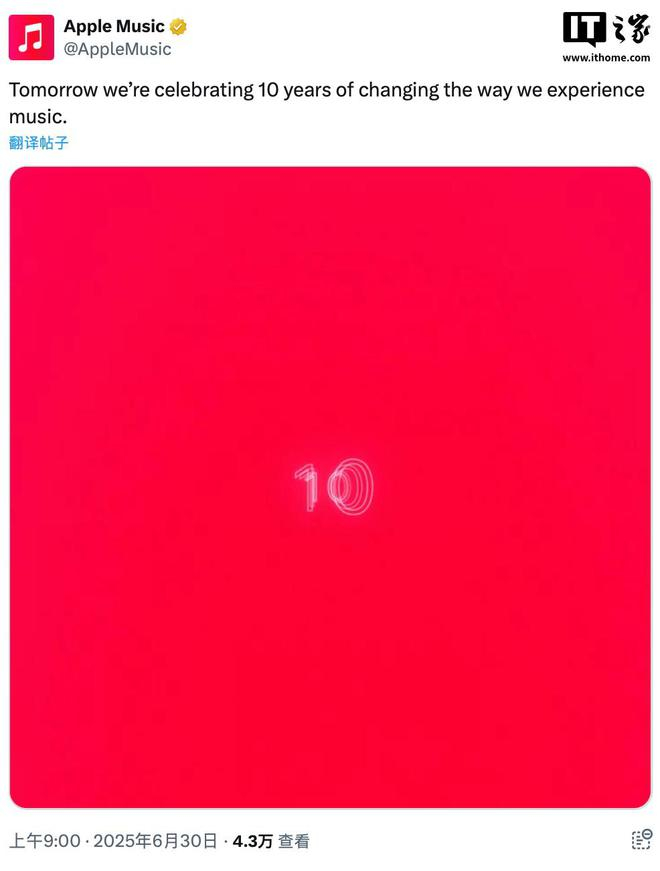 IT之家 6 月 30 日消息,苹果 Apple Music 今日于 X 平台发文,宣布该服务诞生 10 周年,将于明日举行“音乐体验方式改变十周年”活动。