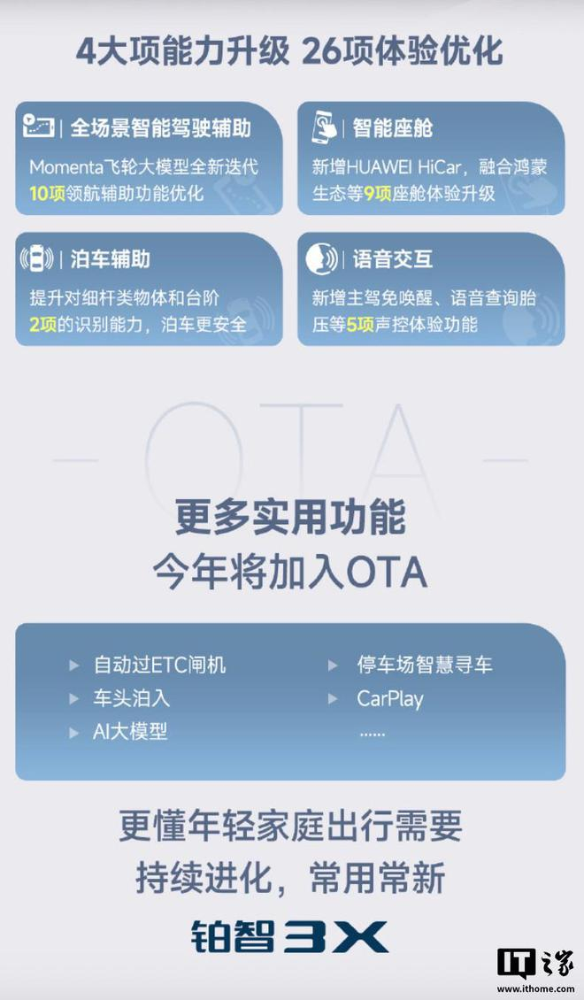 IT之家 6 月 30 日消息,广汽丰田宣布旗下铂智 3X 首次 OTA 更新将于今日起分批推送,主要为汽车新增华为 HiCar 互联 / 主驾免唤醒等功能,深度融合华为手机鸿蒙应用。