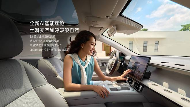 零跑 B01 搭载了高通 SA8295P 旗舰级座舱芯片和双 AI 语音大模型,配合 Leapmotor OS 4.0 Plus 交互系统,支持多模态识别、 AI语音助手、零动空间、实时感知的 3D 灵动桌面、一镜到底动效等功能,256 色的氛围灯也可以跟随车内音乐律动。