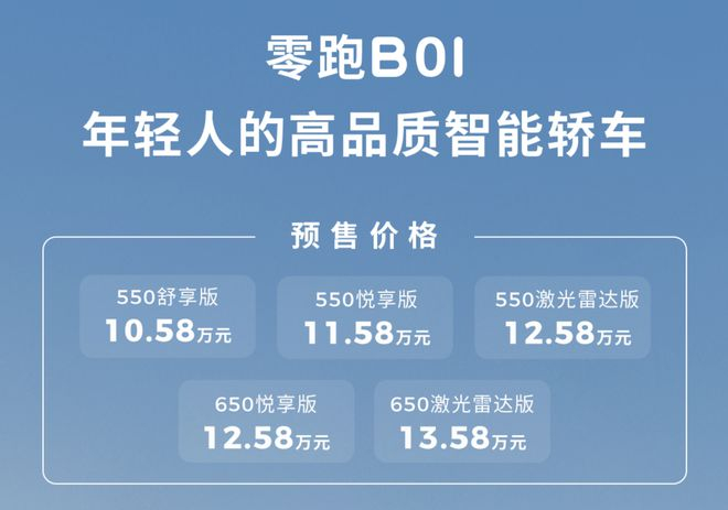 零跑 B01 这次共有两个续航版本,550km 续航的起步预售价为 10.58 万元,带激光雷达的版本为 12.58 万元;650km 续航版本的起步预售价为 12.58 万元,激光雷达版本为 13.58 万元。