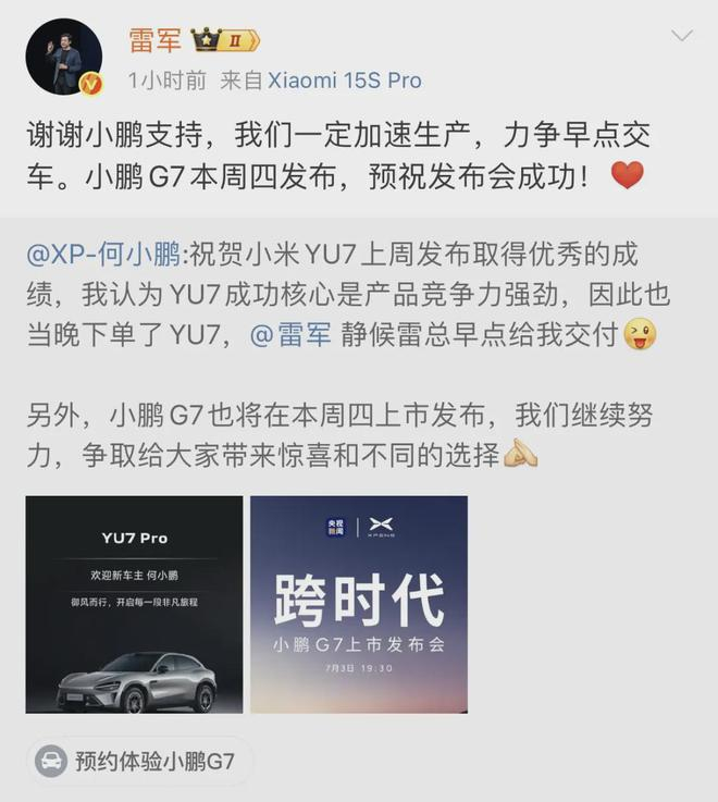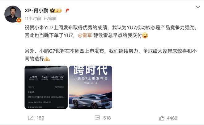 6月30日,小鹏汽车CEO何小鹏发文称,自己也下单了小米YU7。