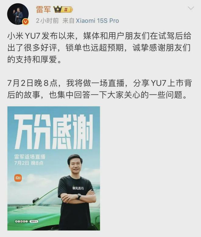30日,雷军还更新了一条微博称,小米YU7发布以来,媒体和用户朋友们在试驾后给出了很多好评,锁单也远超预期,将于7月2日晚8点做一场直播,集中回答大家关心的一些问题。