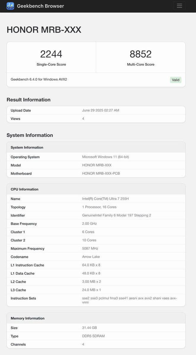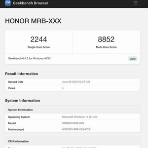 IT之家 7 月 1 日消息,科技媒体 notebookcheck 昨日(6 月 30 日)发布博文,报道称荣耀 MagicBook Art 14 2025 笔记本明日(7 月 2 日)发布前夕,现身 GeekBench 跑分库,6.4.0 版单核成绩 2244 分,多核成绩 8852 分。