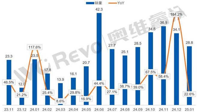 中国学习平板线上零售销量和同比情况 (2023年11月-2025年1月)
