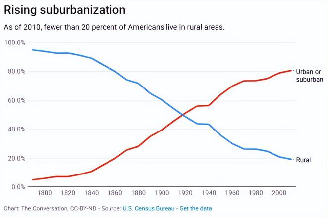 而根据官方数据,截止到 2010 年,美国郊区与城区的人口比例为 8:2,郊区人口占绝大多数。