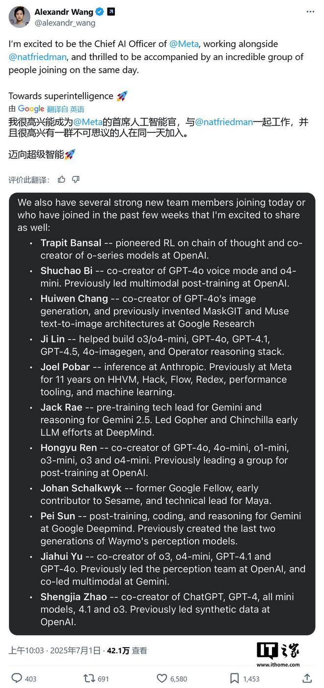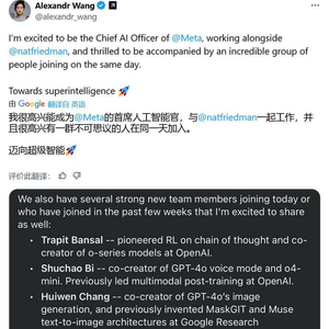 扎克伯格于本周一发布全员信,表示将整合 AI 资源,纳入到全新的 MSL 部门中,由前数据标注初创公司 Scale AI 的首席执行官汪滔(Alexandr Wang)领导。IT之家附上汪滔的推文截图如下: