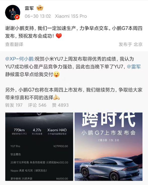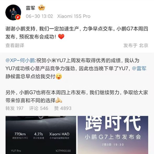 6月30日,小鹏汽车董事长何小鹏发文,称自己下单了小米YU7,并喊话雷军“早点给我交付”。雷军回应:“谢谢小鹏支持,我们一定加速生产,力争早点交车。小鹏G7本周四发布,预祝发布会成功!”