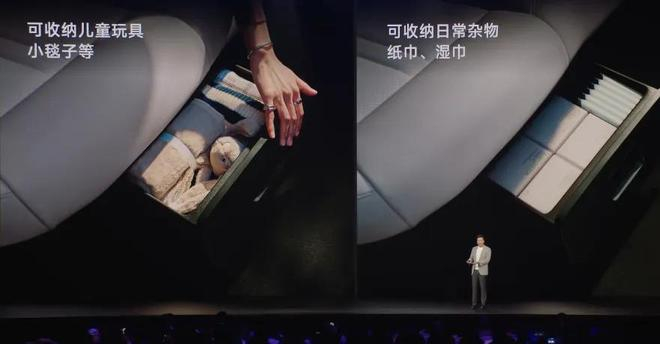 讲后排座椅下的储物盒,他要强调,可以拿来放玩具、毯子,或者放纸巾、湿巾,这些确实都是有娃家庭常年扔在后座上的东西。