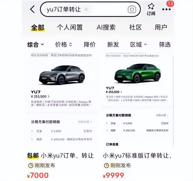 在同一时间,某二手交易平台上,已经出现了海量的YU7订单转让帖,黄牛们少则加价几千,多则上万。他们敢挂这么高,只能说明,是真的有人为了早点提车额外多付钱。用户们的这种热情,已经不能单纯用“YU7的产品力好”来解释了。