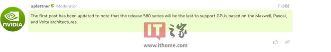 IT之家 7 月 1 日消息,根据英伟达在开发者论坛更新的 Unix 图形功能淘汰时间表,580 系列将成为最后一个支持 Maxwell、Pascal、Volta 三架构 GPU 的驱动系列。