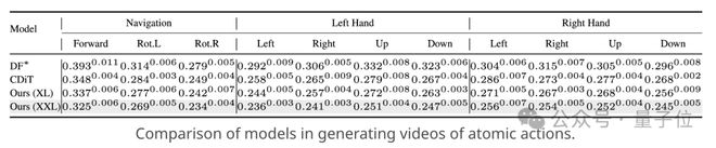 在原子动作控制实验里,针对 “左手向上”“全身向前” 等基础动作,PEVA的LPIPS值比CDiT基线低5%-8%,证明其能更精准地捕捉细粒度动作带来的视觉变化。