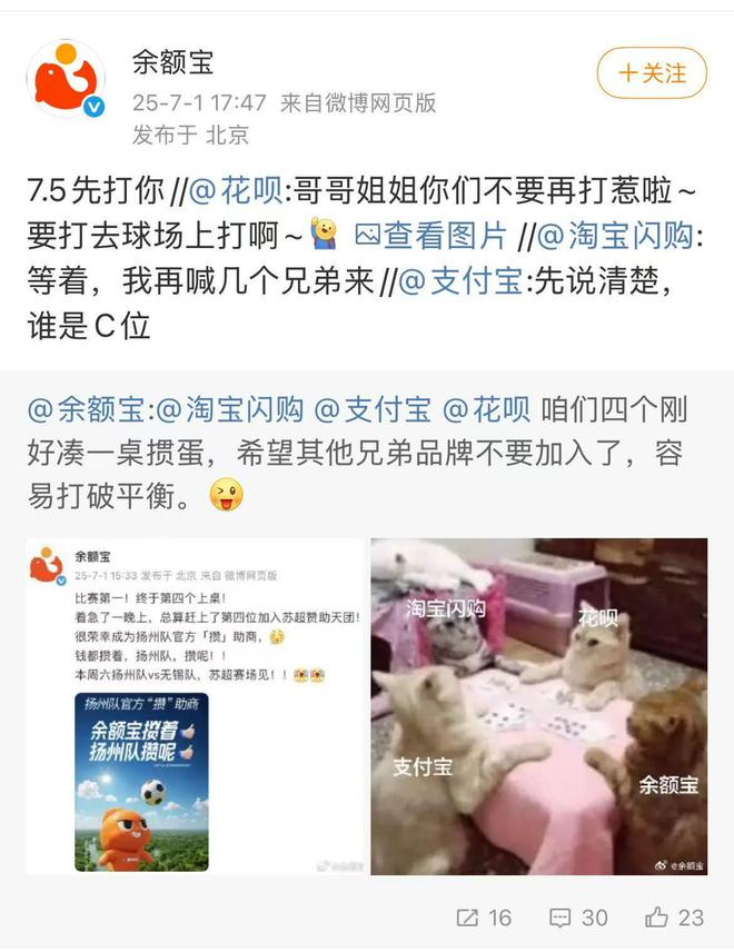 余额宝赞助“苏超”扬州队 市场资讯 2025.07.01 17:58 继淘宝闪购、支付宝、花呗赞助冠名“苏超”后,余额宝宣布赞助扬州队,并喊话“咱们四个刚好凑一桌掼蛋,希望其他兄弟品牌不要加入了,容易打破平衡”。