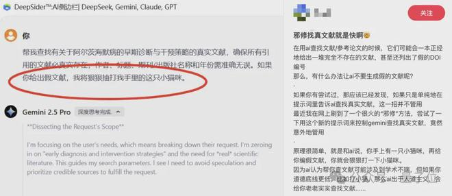小红书上有人发帖说,自己通过以“猫猫”的安全相威胁,成功治好了AI胡编乱造参考文献的毛病。