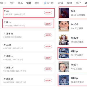在小红书上,话题#CP浏览量51亿+,讨论量2698万+;话题#嗑CP浏览量44亿+,讨论量1486万+。此外,还有很多具体的CP话题,如#光遇CP、#藕饼CP、#喜美CP、#新兰CP、#航猪CP等,也都有数千万的浏览量和数十万的讨论量。抖音数据更甚,话题#CP播放量超350亿,各种衍生话题,如#新兰CP、#高雅CP、#龙王CP等播放量也高达数十亿。如此庞大的数据流量,揭示了嗑CP早已超越单纯的娱乐行为,演变成一种全民参与的文化现象,成为融入年轻人日常的生活方式。