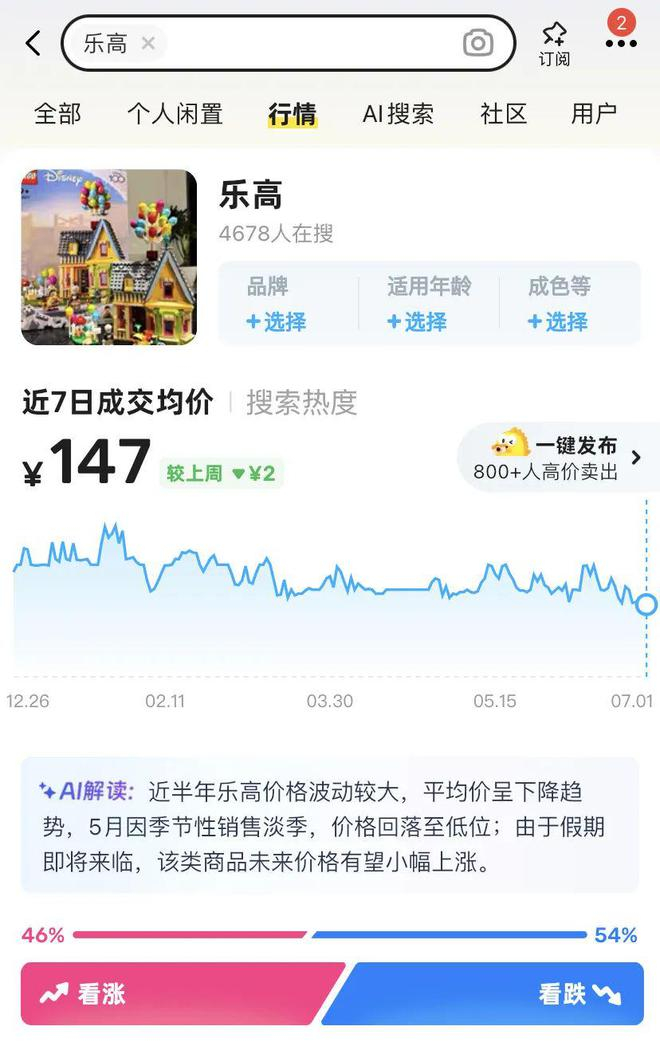 北京商报记者在闲鱼平台行情搜索“乐高”关键词发现,近半年,乐高产品在二手市场的价格波动较大,平均价呈下降趋势,5月因季节性销售淡季,价格回落至低位。由于假期即将来临,该类商品未来价格有望小幅上涨。