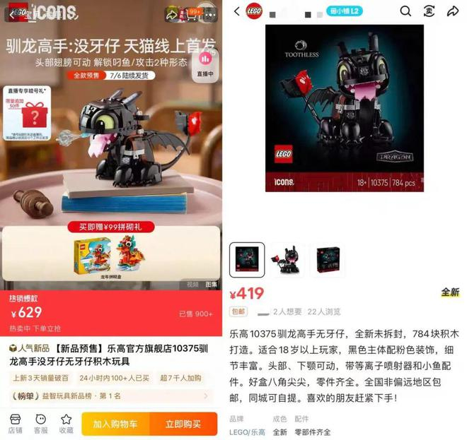 近期,真人电影《新·驯龙高手》正在各大影院热映。借电影上线,乐高集团首次涉及《驯龙高手》IP,并发布了面向成年玩家的Icons系列。据官方消息,新品Icons10375无牙仔套装预计在7月1日发售,定价629元,含有784pcs。