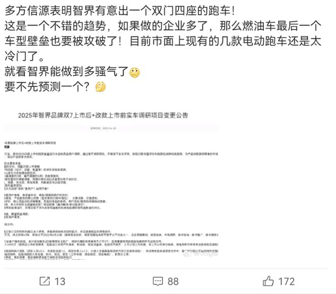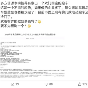 7月1日,有博主爆料称智界品牌计划推出一款双门四座纯电轿跑车,目前处于用户需求调研阶段。该项目已出现在奇瑞集团2025年新车调研文件中,明确将“两门四座跑车用户需求”纳入产品规划。
