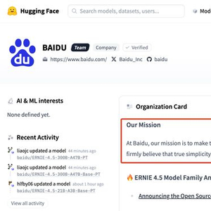 当然,有关Mission的这两句话是最近几天新加的。主要之前如果这么写,好像也不合适。因为在这轮文心大模型4.5系列模型开源之前,百度在Hugging Face上并没有开源过任何自己的私有模型。