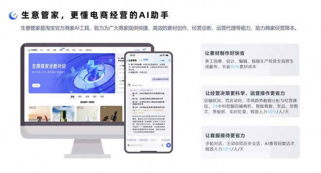 经营策略方面,基于淘宝积累的海量消费者数据及商家经营数据,生意管家具备商业趋势预判能力,能够为广大商家提供快捷、高效的 AI Agent 能力,以智能经营决策,替代过去的经验主义。同时,帮助商家节省时间和人力成本,带来更优质素材下的商品转化增量。