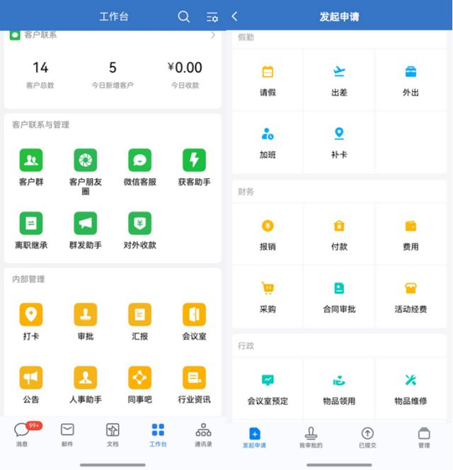用户可在企业微信鸿蒙版的【工作台】页面使用审批功能。目前已支持假勤、财务、行政、人事等多个办公大类,覆盖请假、出差、报销、补卡、维修、入职等20+高频办公场景的审批流程。 用户可以随时随地发起申请,通过企业微信的应用消息通知等功能及时触达审批人,使得审批流程及时闭环,极大提升了整个审批流程的使用体验。