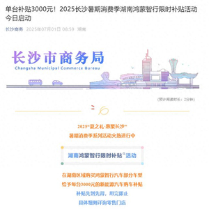 据“长沙商务”公众号消息,湖南开启鸿蒙智行限时补贴活动,在湖南区域购买鸿蒙智行汽车部分车型,给予每台3000元的新能源汽车购车补贴。
