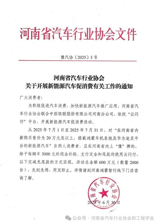 6月30日,河南省汽车行业协会印发《关于开展新能源汽车促消费有关工作的通知》。其中提到,从2025年7月1日至2025年7月31日,对“在河南省内新购买售价为20万元及以上,搭载鸿蒙车机系统及华为途灵平台的新能源汽车”自然人消费者,且在河南省内上“豫”牌的,给予每车3000元的现金补贴。活动总金额600万元(数量2000辆),先到先得,用完即止。河南省汽车行业协会工作人员表示,此活动为限时活动,属于一种“定向补贴”。