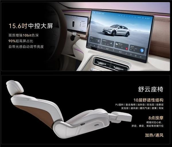 内饰:鸿蒙座舱HarmonySpace 5,五屏联动+语音助手“小艺”, 支持四大情景模式;云朵座椅2.0,女王副驾可163°舒躺。
