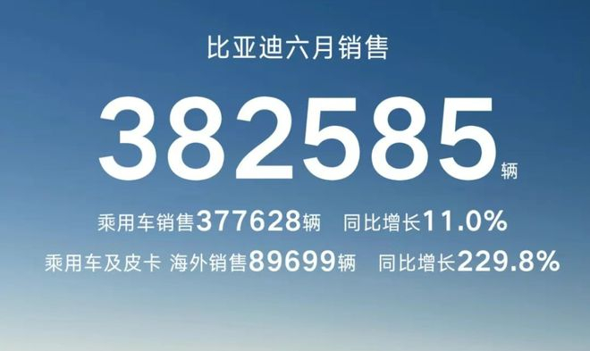 7月1日,比亚迪公布了2025年6月份的销量情况。数据显示,比亚迪在该月份乘用车销售377628辆,相较去年6月的314668辆,同比增长约11%;其中海外销售89699辆,相较去年6月的26990辆,同比增长229.8%;国内市场销量287929辆,相较去年的314668辆,同比下跌近8.5%。
