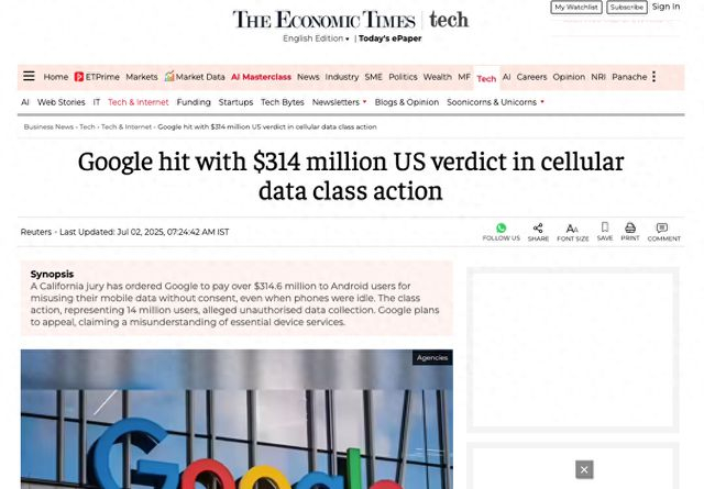 【环球网科技综合报道】7月2日消息,据外媒报道,美国加州圣克拉拉县高等法院陪审团周二作出里程碑式裁决,认定谷歌母公司Alphabet滥用安卓用户隐私,需向该州安卓智能手机用户支付总计3.146亿美元(约合人民币22.8亿元)的赔偿金。这一判决标志着美国首例针对科技巨头“后台数据传输”行为的集体诉讼取得实质性胜利,或引发全球范围内对智能设备数据收集边界的重新审视。