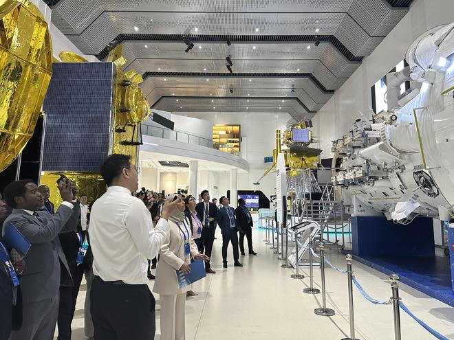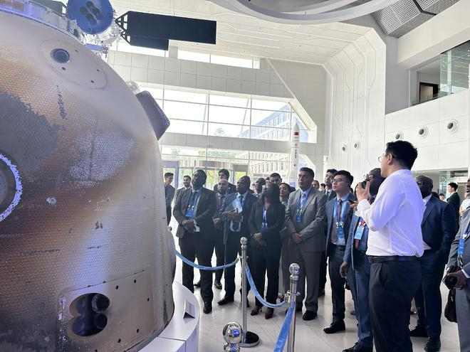 空间站核心舱等比例模型、神舟十七号返回舱实物、嫦娥五号带回的月球样品……在中国空间技术研究院展示中心内,珍贵的展示品激发使节们深厚的探索兴趣。他们驻足观看,详尽了解中国在载人航天、深空探测和各类应用卫星等领域的辉煌成就,更通过零距离“触摸”,直观感受中国航天事业坚实的发展进程。