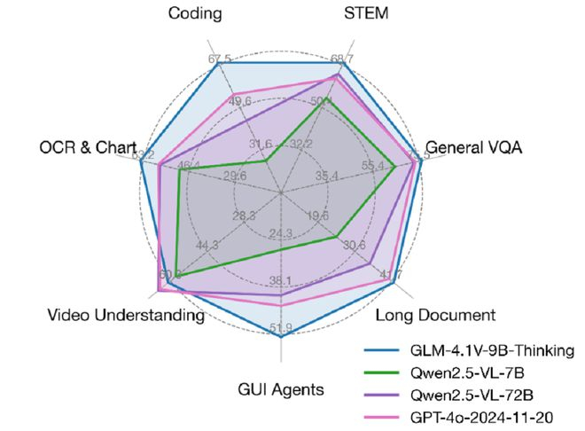 在基准测试中,GLM-4.1V-9B-Thinking展现出了类似尺寸模型中领先的水平,并在通用视觉问答、STEM、OCR & Chart、长文档理解、GUI Agents和多模态编码以及视频理解领域表现出色。