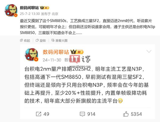 这位博主表示:“听说 (SM8850s) 套片报价更低,可能明年才会上;但目前还没听说谁家会用,通子(高通)主供还是台积电 N3p SM8850,三星版不知道会不会上……”。