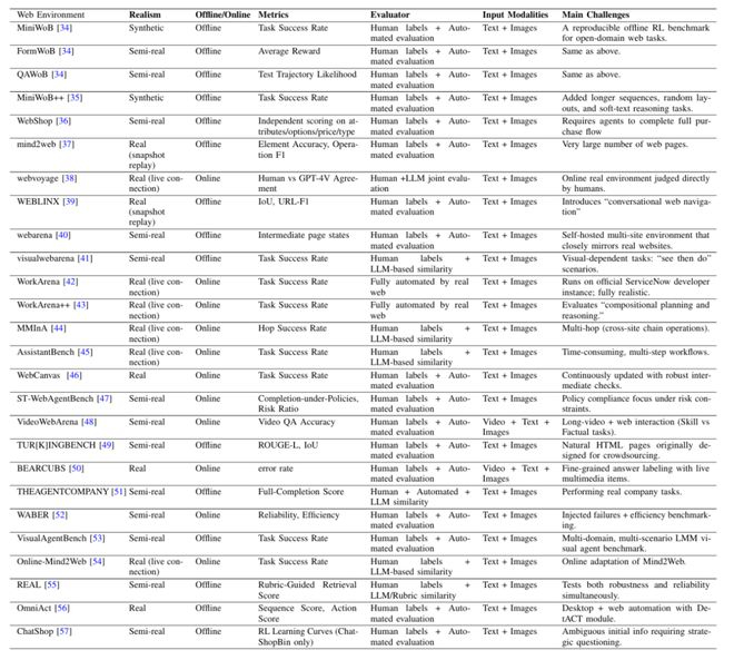以表 1 为例,我们列出了我们认为最重要的属性:真实性,离线 / 在线,评测者,输入模态,主要挑战。并将所有 web 环境的基准归到这些属性中。