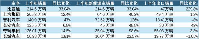 具体来看,今年上半年,比亚迪累计销量为214.6万辆,去年累计为161.3万辆,同比增加33.04%。比亚迪6月新能源车销量为38.26万辆,去年同期为34.17万辆。