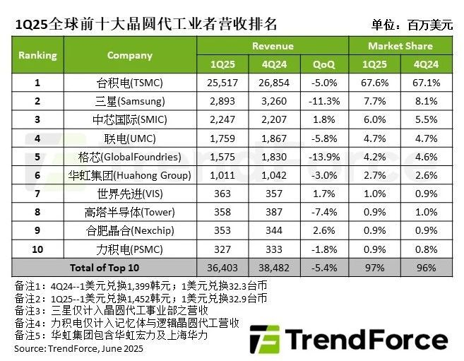 2025年第一季度,全球前五大晶圆代工业者的市场份额如下:台积电(TSMC)以67.6%的市场份额稳居第一;三星(Samsung)以7.7%的市场份额位居第二,其营收下降了11.3%;中芯国际(SMIC)以6.0%的市场份额排名第三,营收增长了1.8%;联电(UMC)以4.7%的市场份额位列第四,营收下降了5.8%;格芯(GlobalFoundries)以4.2%的市场份额排名第五,其营收下降了13.9%。这五家公司合计占据了全球晶圆代工市场90.2%的份额。