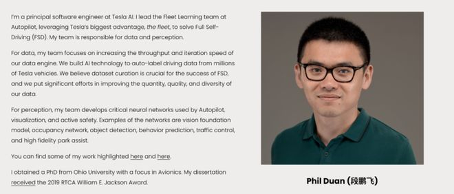 段鹏飞(Phil Duan)是特斯拉 AI 的首席软件工程师,现负责 Autopilot 下的 Fleet Learning 团队,致力于推动特斯拉自动驾驶系统(FSD)中「数据 + 感知」核心模块的建设。