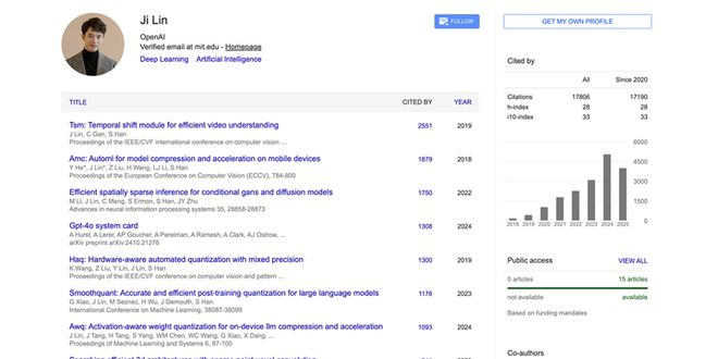 学术方面,他在模型压缩、量化和多模态预训练等方向有多篇高影响力论文,Google 学术总引用数超过 17800,代表成果包括视频理解模型 TSM、硬件感知量化方法 AWQ、SmoothQuant 以及视觉语言模型 VILA。