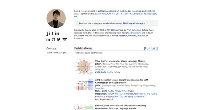Ji Lin 主要从事多模态学习、推理系统与合成数据方向的研究。他是多个核心模型的贡献者,包括 GPT-4o、GPT-4.1、GPT-4.5、o3/o4-mini、Operator、以及 4o 图像生成模型等。
