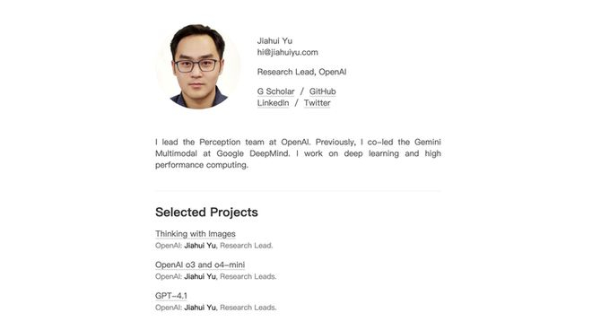 在 OpenAI 任职期间,Jiahui Yu 担任感知团队负责人,主导开发 GPT-4o 图像生成模块、GPT-4.1、o3/o4-mini 等重要项目,提出并落地了「Thinking with Images」感知体系。