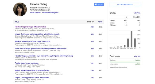 2013 年,Huiwen Chang 本科毕业于清华大学计算机系(姚班),后赴美国普林斯顿大学攻读计算机科学博士,研究方向聚焦于图像风格迁移、生成模型和图像处理,曾获微软研究院奖学金。