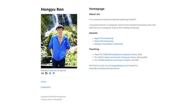 Hongyu Ren 本科在北京大学获得计算机科学与技术学士(2014–2018)学位,随后在斯坦福大学获得计算机科学博士(2018–2023)学位。