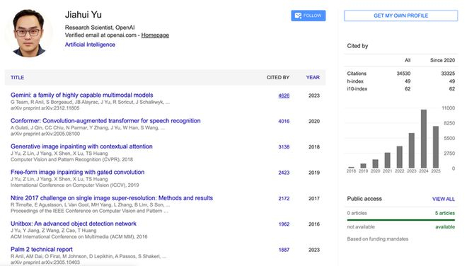 Jiahui 在 Google 学术上总引用次数超过 34500 次,h 指数达 49,代表性研究成果包括图文对齐基础模型 CoCa、文本生成图像模型 Parti、神经网络可伸缩设计 BigNAS,以及广泛应用于 Adobe Photoshop 的图像修复技术 DeepFill v1 和 v2 等。
