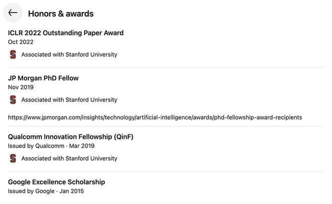在学术表现上,他 Google 学术总引用数超过 21,000 次,h 指数为 25,曾获得过 ICLR 2022 Outstanding Paper Award、JP Morgan PhD Fellow、Qualcomm 创新奖学金(QinF)与 Google Excellence Scholarship 等多项奖项。