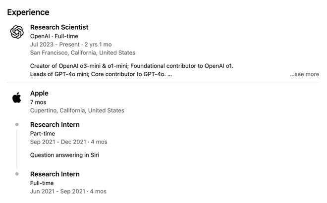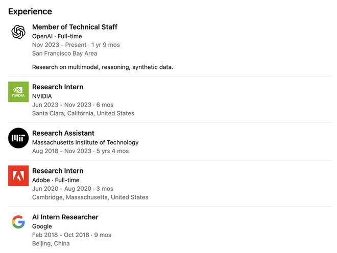 在加入 OpenAI 之前,他曾在 Google、微软以及英伟达有过多段实习经历,比如 2021 年在苹果担任实习研究员期间,参与 Siri 问答系统的搭建。