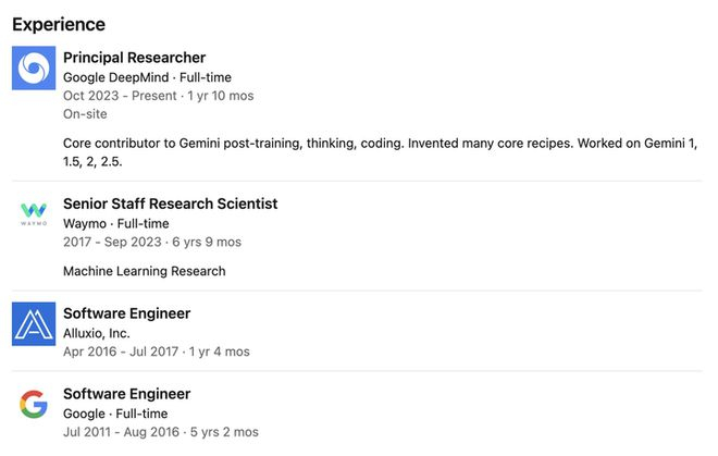 他曾在 Google DeepMind 担任首席研究员,期间主攻 Gemini 模型的后训练、编程和推理工作,是 Gemini 系列模型(包括 Gemini 1、1.5、2 和 2.5)后训练、思维机制构建与代码实现的核心贡献者之一。