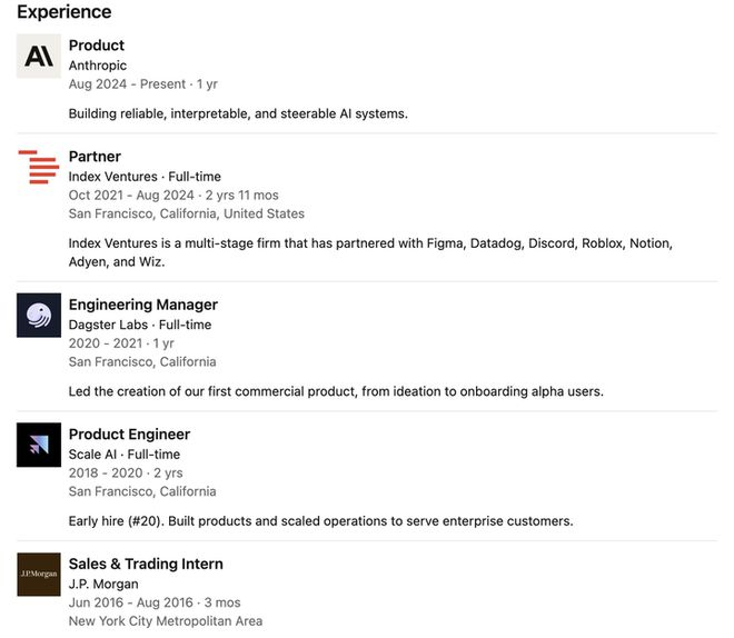 在加入 Anthropic 之前,她曾是知名风投公司 Index Ventures 的合伙人,任职近三年,期间深度参与多家顶尖创业公司的早期投资与战略支持。
