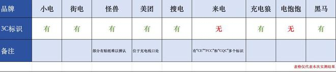 然而,也有部分品牌存在问题。例如,电饱饱的共享充电宝没有3C标识,来电充电宝底部虽然有“CE”“FCC”和“CQC”(欧洲合格评定证书、美国联邦通信委员会认证、中国质量认证中心主导的自愿性认证)等标识,但并未找到3C标识。