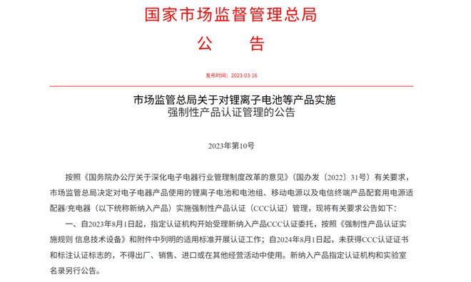 记者注意到,据市场监管总局2023年发布的对于移动电源等产品实施强制性产品认证(CCC认证)管理的相关规定中,要求自2023年8月1日起,指定认证机构开始受理新纳入产品CCC(编注:即3C)认证委托,按照《强制性产品认证实施规则 信息技术设备》和附件中列明的适用标准开展认证工作;自2024年8月1日起,未获得CCC认证证书和标注认证标志的,不得出厂、销售、进口或在其他经营活动中使用。